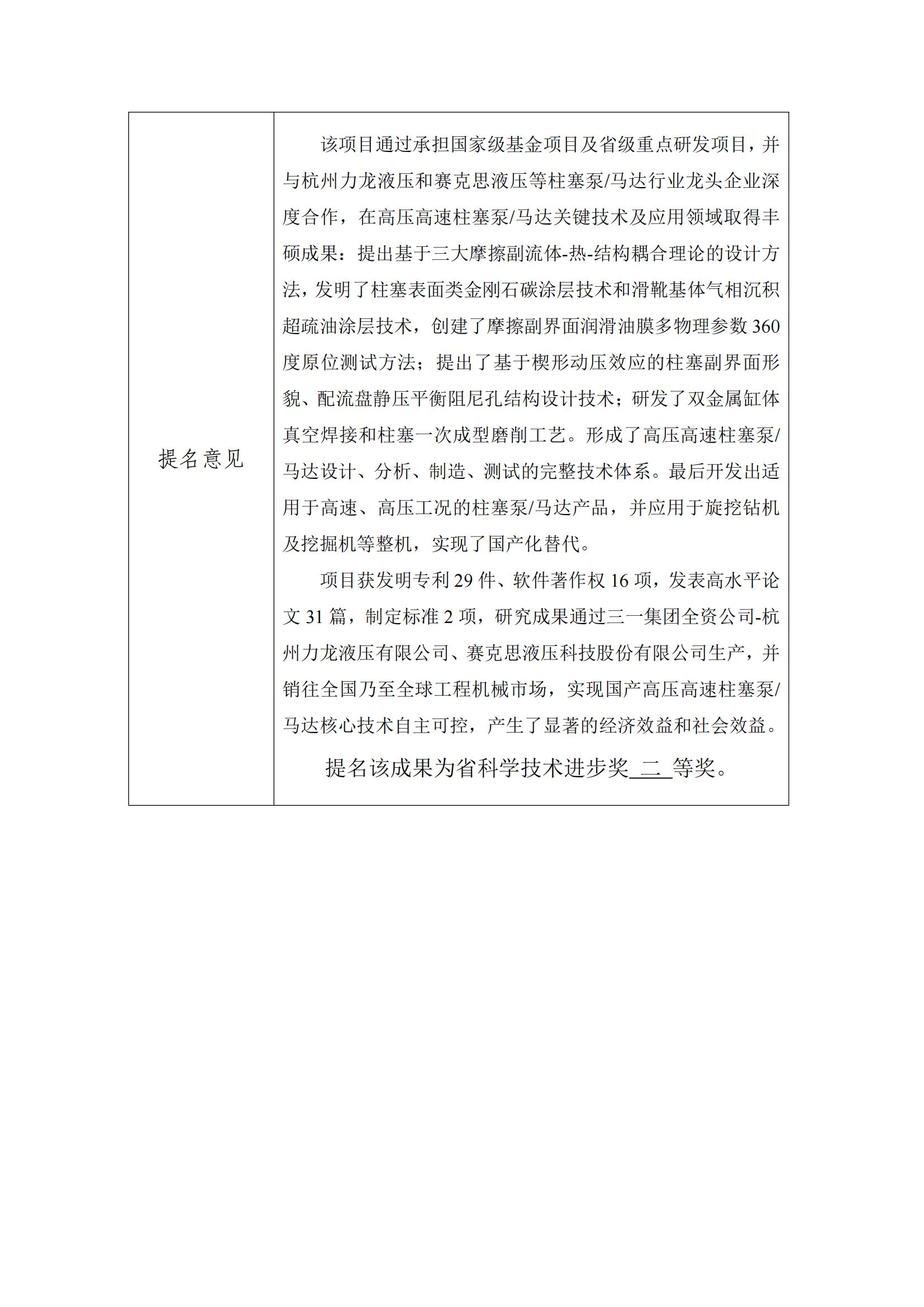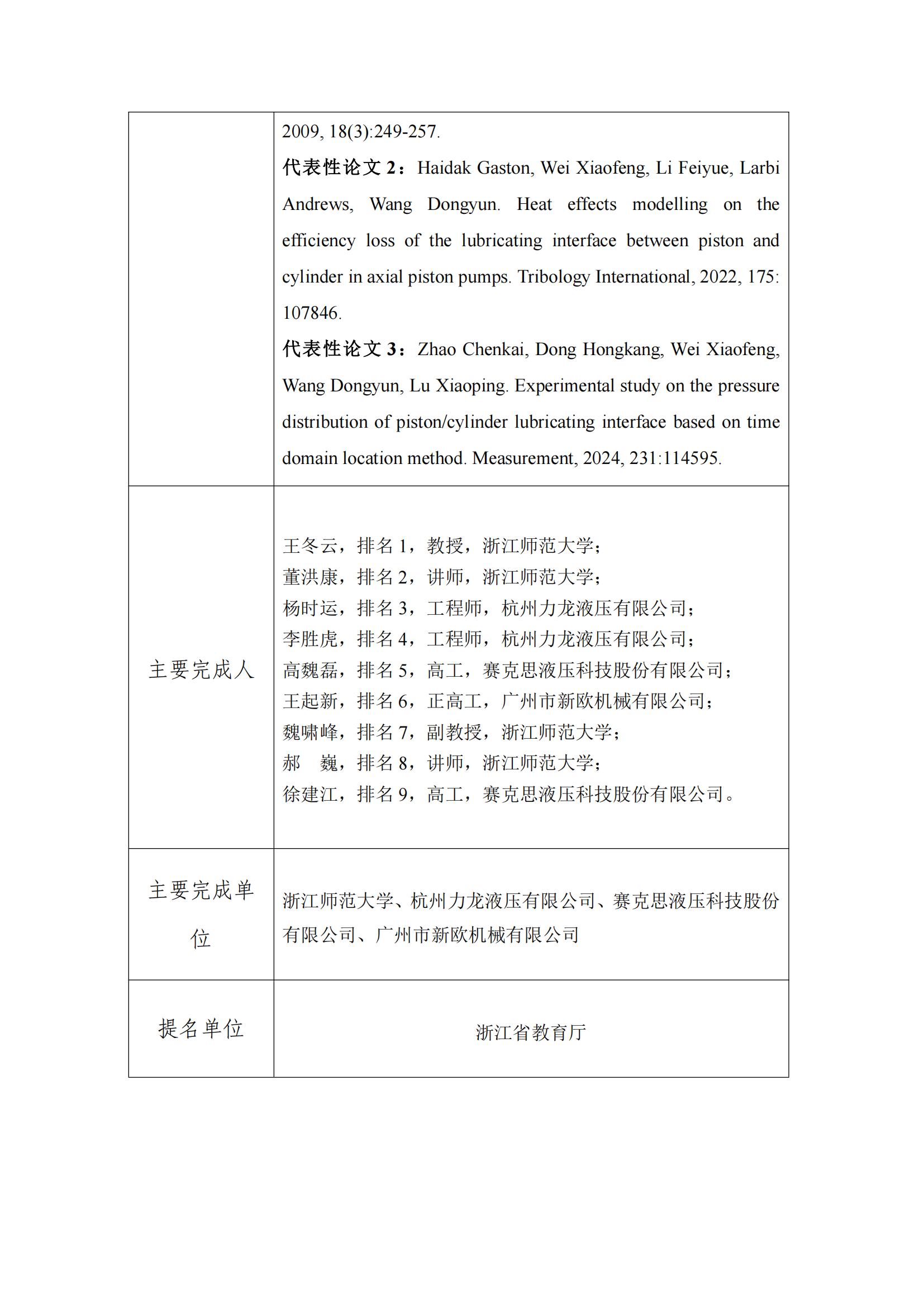 根据浙江省科技厅《浙江省科技厅关于开展2024年度浙江省科学技术奖提名工作的通知》要求,我公司高魏磊、徐建江同志参与的项目《高压高速柱塞泵/马达关键技术及应用》予以公示(详见附件),对公示持有异议的,请在公示期内向总经办反映。